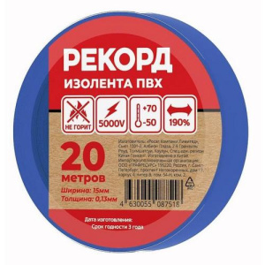 Изолента Рекорд ПВХ 15мм*20м синий (10/200)