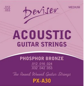 Струны для акустических гитар DEVISER PX-A30 количество струн в комплекте - 6, материал - нержавеющая сталь, оплетка - фосфорная бронза, никелированный шарик на концах струн, натяжение - Medium, размер: .012 .016 .024 .032 .042. 053